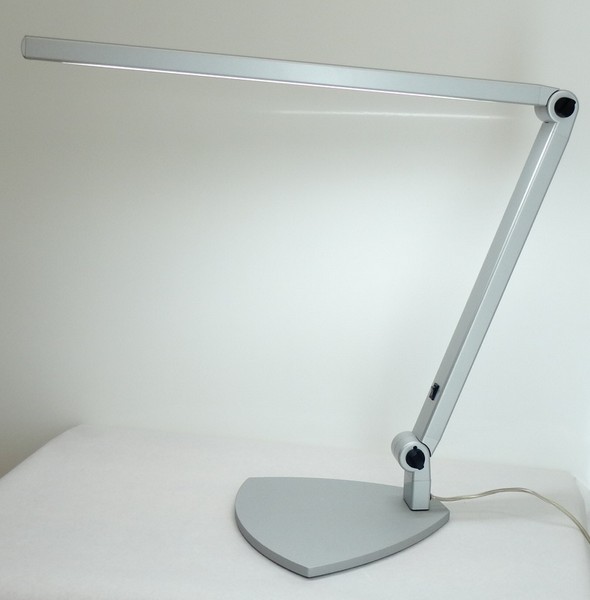 Formschöne, lichtstarke Tischleuchte, flimmerfrei! Der ausladende Leuchtenarm erlaubt grossflächige Ausleuchtung Ihres Arbeitsfeldes. Wahlweise mit stabilem Tischfuss oder platzsparendem Klemmfuss